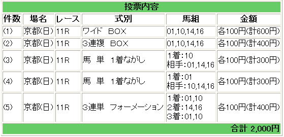 | 5 | 14 | キンシャサノキセキ | 秋山 | 5 | ● | 馬連 | 07−10 | 650円 |