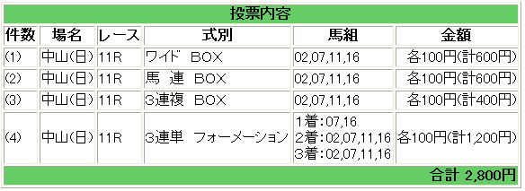 | 10 | 11 | ペールギュント | 上村 | 9 | ● | 3連複 | 01−06−07 | 3,800円 |