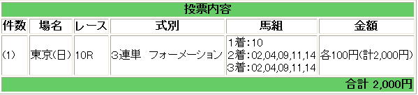| 10 | 9 | インティライミ | 佐藤哲 | 3 | ● | 3連複 | 02−04−10 | 1,450円 |
