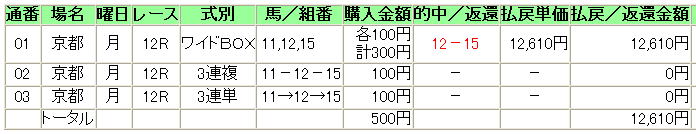 | 11 | 8 | ソブリンブライト | 幸英明 | 14 | 3連単 | 12−15−02 | 1,110,390円 |