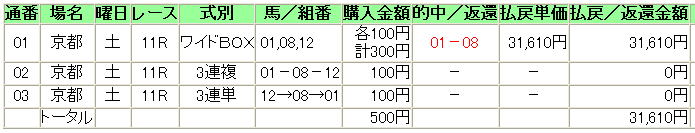 | 5 | 12 | サカラート | 武豊 | 2 | ◎ | 馬連 | 01−08 | 193,620円 |
