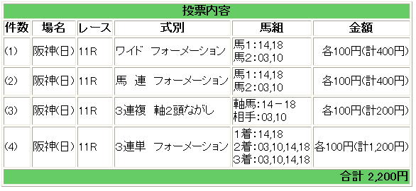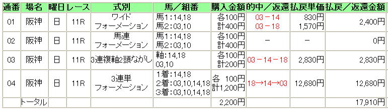 | 1 | 18 | ダイワスカーレット | 安藤勝己 | 3 | ○ | 複勝 | 18 | 130円 |