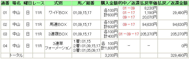 | 1 | 17 | ヴィクトリー | 田中勝 | 7 | ○ | 複勝 | 17 | 590円 |