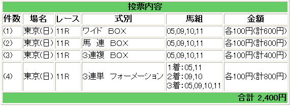 | 着順 | 馬番 | 馬名 | 騎手 | 人気 | 買い目 | 単勝 | 02 | 440円 |