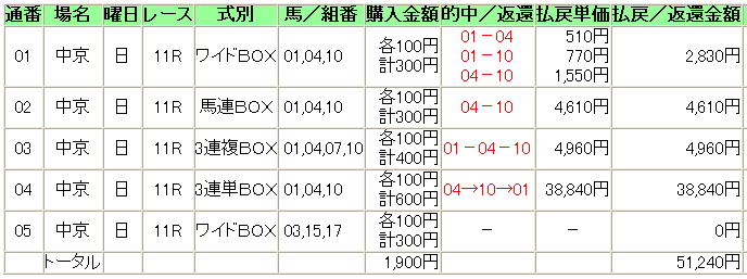 | 1 | 4 | ファイングレイン | 幸 | 4 | ○ | 複勝 | 04 | 240円 |