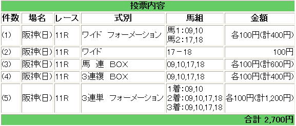 | 着順 | 馬番 | 馬名 | 騎手 | 人気 | 買い目 | 単勝 | 15 | 4,340円 |
