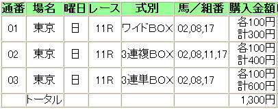 | 1 | 6 | 2.0 | ウオッカ | 武豊 | 新1単1複1 | 1 | ◎ | |