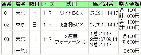 | 着順 | 馬番 | 馬名 | 騎手 | 人気 | オッズ | 買い目 | 単勝 | 11 | 150円 |
