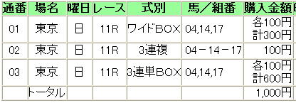 | 着順 | 馬番 | 馬名 | 騎手 | 人気 | オッズ | 買い目 | 単勝 | 17 | 210円 |