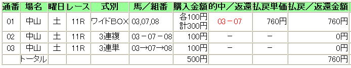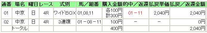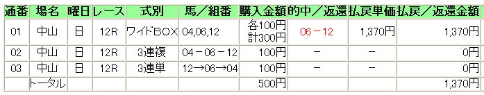 | 1 | 12 | ダンスフォーウィン | 柴田善 | 1 | 1.6 | ○ | ・11Rが大荒れだったから、変な荒れ方かなと 思い、本命と100倍以上を探す。 ・11番人気の勝浦と迷うが、NEXTソフトの マイニングを採用。 ・岩田が来るとはほんとにおしい。 |