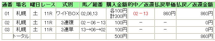 | 1 | 13 | メイショウトウコン | 武幸 | 1 | 2.3 | ○ | ・2番人気は飛ばなかった。 ・ダートの芦毛。パドックもまし。しかし、 結果は最下位でした。 |