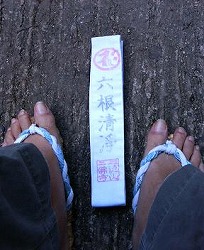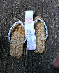 ・拝観料400円。 ・入山料200円。 ・入山の住所・氏名・人数を届ける。 ・靴の裏のチェックを受ける。 革靴風の運道靴だったが駄目出し。 ・わらじ500円。 ・六根清浄のたすきを掛け いざ出発。 |