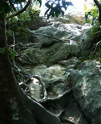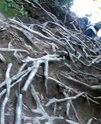 ・さあ、いよいよ登り始め。 ・木の根っこを持って登っていく。 |