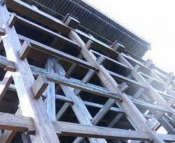 ・岩場の中腹に文殊堂がある。 ・みごとな足場が組んである |