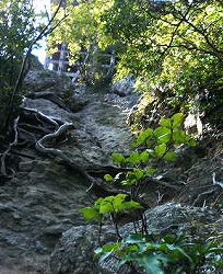 ・くさり坂。 ・文殊堂横のくさりにつかまり 一気に大岩を上る。 |