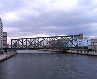 | ・大正駅を過ぎるとまたすぐに川に突き当たる。さすが大阪。 木津川の大浪橋らしい。石碑が建っていた。地名のようだなんとか島。 すいません。わすれました。 ・橋の上から環状線の橋を撮る |
