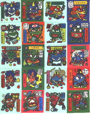 1986年8月に発売されたドキドキ学園チョコおばけ組。シールは、タイトルどおりの「学園もの」でしたが、蓄光素材を使用しており、そこに描かれていた「おばけ」にヒントを見出したようで、製品名はドキドキ学園チョコのままで、「おばけ組」が「おもしろ妖怪」にリニューアル。 妖怪シールに同じ番号の開運シールを貼り合わせて「妖怪退散」するという遊び方ができ、単発的な製品だった「おばけ組」から、今度は長期的な販売を視野に入れたようで、シール裏面(台紙)に印刷を施し、「妖怪シール」「開運シール」にナンバリングを開始し、コレクション性を高めています。約1ヶ月ほどで開運・妖怪シールを10種ずつ入替えて、事実上の続弾となっています。 当たりとして、1弾から4弾まではホログラム素材の「星座シール」、6弾ではホログラム素材でオリジナルキャラクター「最強神シール」が封入されていました。第5弾はおばけ組のギミックを再利用した夜行(蓄光)シールが登場し、ホログラムシールがない替わりに「ストックブックプレゼント」で販促に繋げています。 ※星座シールは第4弾まで12星座全てが封入されていたと推測され、第7弾(アタック7)から開運軍団vs妖怪軍団シリーズとしてリニューアルした際に、アタック1からアタック4の各アタックに3星座ずつ分かれていた弾分け設定になっています。 |