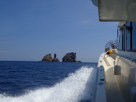 トカラに突入 2日目からはいよいよトカラ列島に! まずはトカラの北端にある平瀬、通称ニヨンです。 トカラにしてはり海の青さはいまひとつ? 2日目以降、臥蛇や中之島、諏訪瀬島はどんどん青くなって行きました。 でも水温は30℃超 ^_^; ぬるーい… |