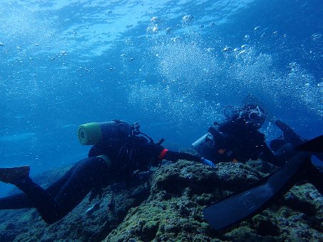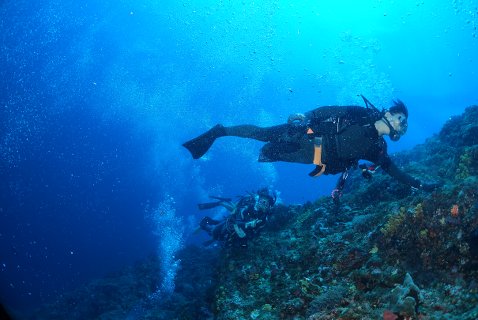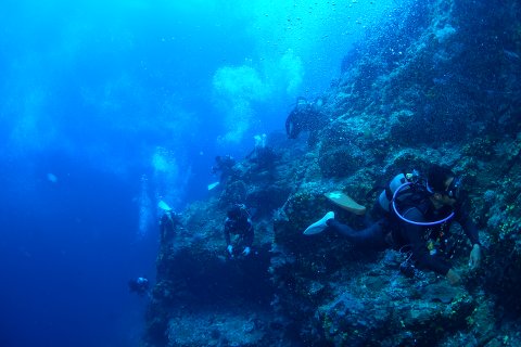 臥蛇立神岩、雄神瀬と続いたので激流コース(ドクロ瀬とか)はやめようかと思いましたが、やっぱり激流へ。 自分も大好きで毎回潜る 「小臥蛇島の沖の瀬」 大きなゴロタの水底から入り組んだ地形にイソバナエリア、そしてクライマックスは2つ3つと続く見事なドロップオフへ。 水温が高いので魚いっぱいというわけではありませんが、本当にきれいで見事なドロップオフです。 浮上はやっぱり強烈ダウンカレント付きでしたが(苦笑) もうみなさんそれが普通と思っているようですが。。 |