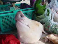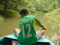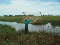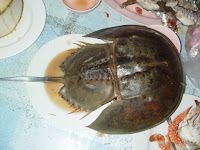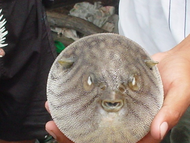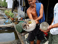| クラビーではボートでマングローブの生える水路を遊覧、生簀のふぐを見せてもらいました。 水から揚げられたふぐははちきれんばかり真ん丸になって寄り目で怒っていました。 |