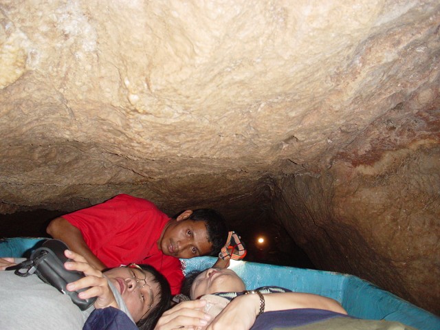 | 驚いたのはここから、突如寝ろと言う、何の事か分からずモタモタしているとボートは水面から4~50Cm程の穴に入って行くらしい、慌てて皆がボートの中で仰向けになる、当然船頭達も仰向けになり手で顔面上の岩肌を押してボートを進める、時々船頭の持っている懐中電灯が消えて真っ暗、船べり船底は岩に擦れている、どのくらいの時間が経ったんだろうか外の光が見えた時は正直ホットしました。 |