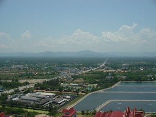 | しょうがないので街から見える丘の上のお寺へブラブラと歩いて行く、お寺の登り口に近づいたあたりで猿がウロウロとしている、チュンポンのゲストハウスのおばさんが言ってた猿が一杯いるとはここの事だと納得、なるほど登り口には猿の大きな像があった。 お寺は作りかけなのか建物はあっても中身のない建物ばかりで仏像が一体しかなかった。 まわりは猿が入るのを防ぐため高い塀を巡らせてあり入り口もバネで自動的に閉まるようになっていた。ここはマレー半島のタイ領の一番狭まった所なので写真の西へ真っ直ぐのびる道はミャンマー国境か周辺に行ってるのかも知れない。 ここからエアコンバスで140バーツ、5時間ちょっと掛けてバンコクへ |
