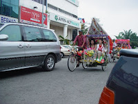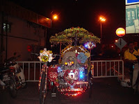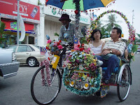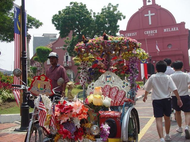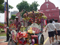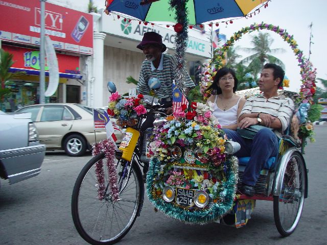| マラッカのトライショー 呼び名は色々だが東南アジア各地で見る、しかしここほど派手なものは見た事がない、夜は電飾でキラキラ | |
