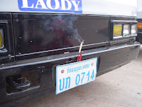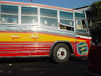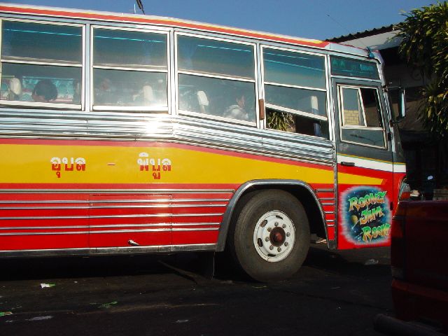 | ウボン市内で見た宣伝シールを全身に貼った車とウボンからピブン行きのバス |