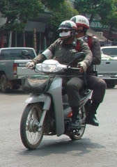 自分達のバイクを歩道上に止めておもいっきり歩行者の邪魔をしている、バンコクなどではそれなりのバイクに乗っているようだがここでは予算の関係か(?)自前のバイクがほとんど、 |