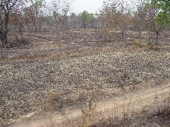 コーラートからブリラムまで3等普通列車で行く事にする。この時期稲刈りも終わり焼畑で黒々とした景色が続く。 もと農民の血が騒ぐのか畑でもないような線路脇、道路脇どこにでも火を付ける。 それでこういう事にもなるかどうかは知らないが、かわいそうに全焼、近くにあった消火栓は使われた様子なし。 |