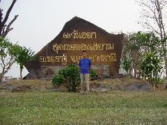 ウボンのバスターミナルからケマラート行き普通バス、料金50バーツ、7時40分発途中のアムナットチャルンで一時間以上ストップしケマラート着12時。 バスターミナルから東へ行けばメコンにぶつかるはずとぶらぶら行く、思ったとおり川にぶつかる、ここまでホテルらしきものはなかった、通りかかったおばちゃんにこの辺にホテルはある?って訊いたらたしかこの道沿いにあったようなと川沿いの道を指差すのでそちらへ、ありましたタイ語表示しかないリゾートが。 川沿いをぶらぶらしてて発見した石碑、多分タイで一番最初に夜が明ける所って書いてある、違う? 確かメーサイに最北の地って看板があった、あとは西と南だな、どこにあるんだろうか? |