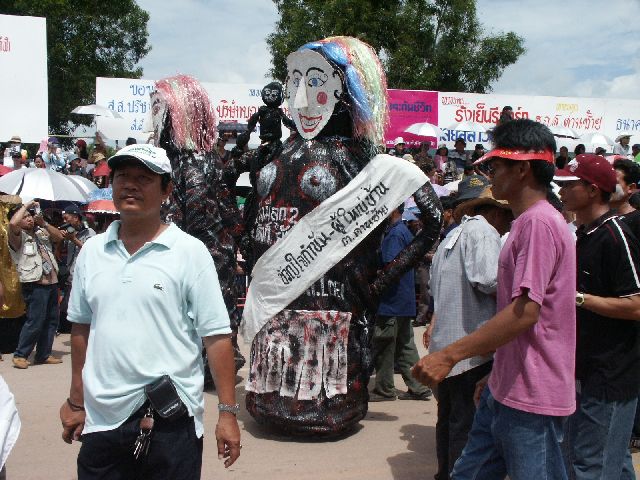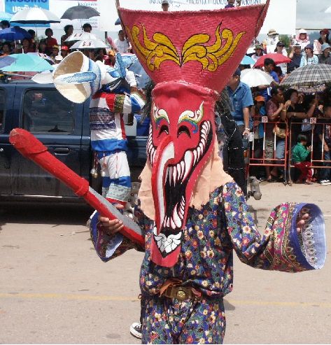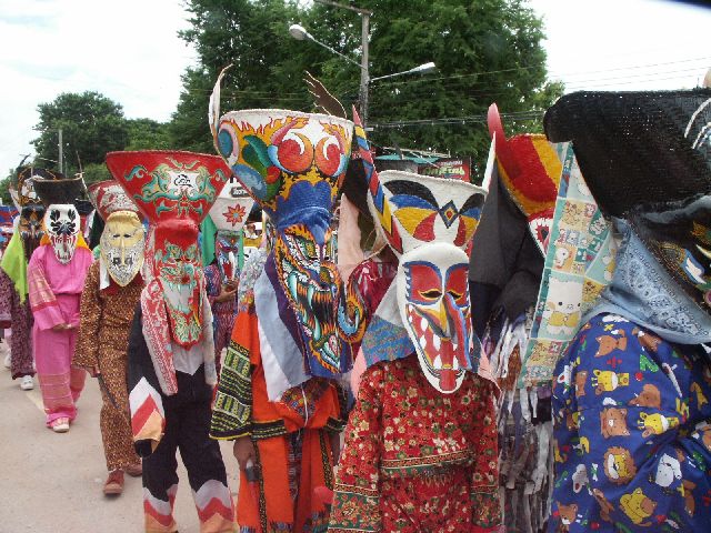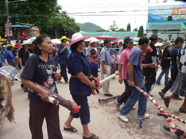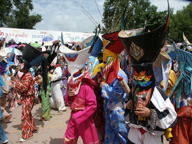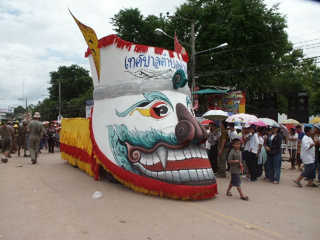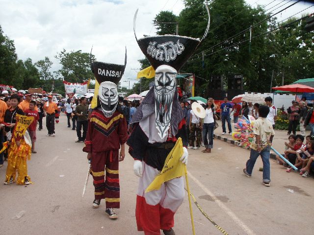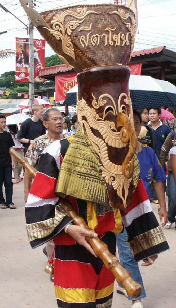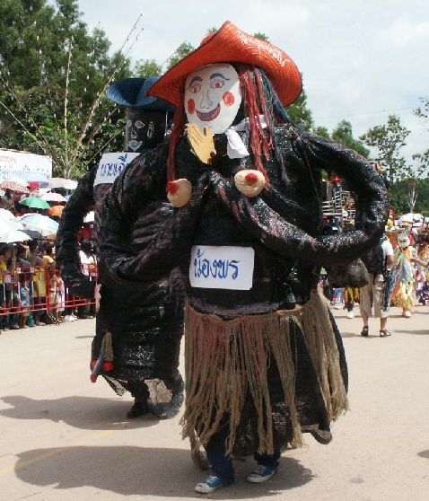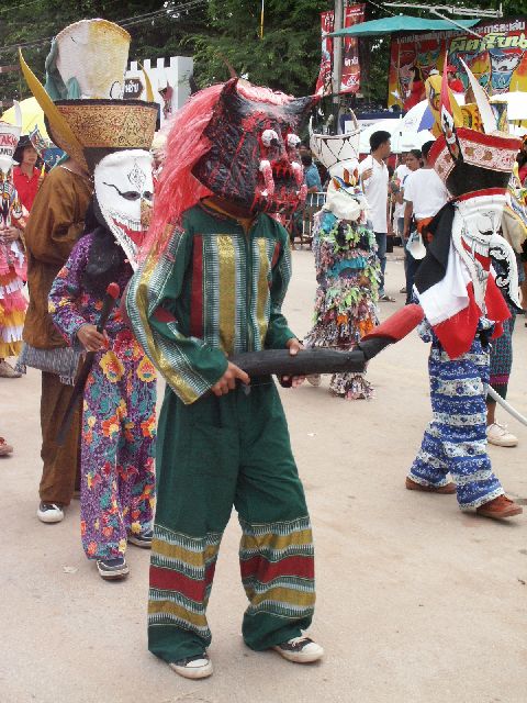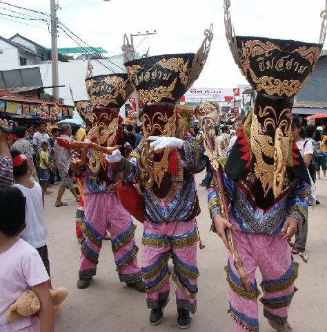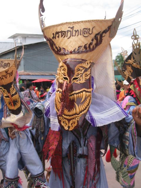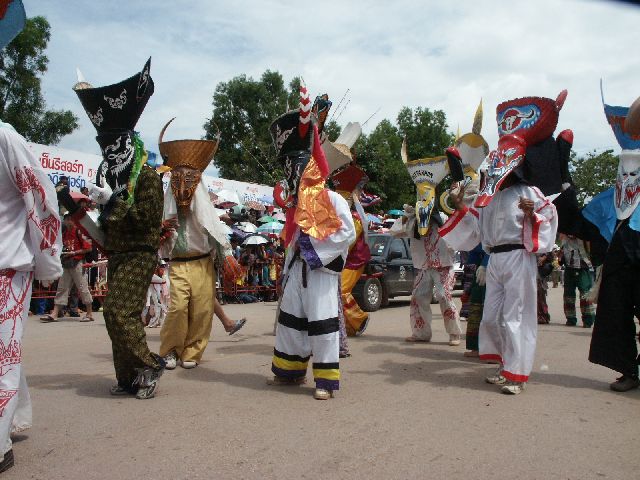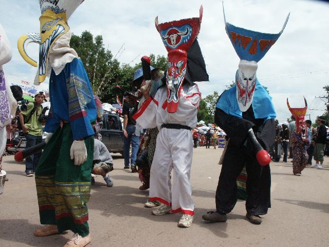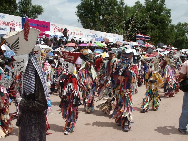 8日 今日から10日までの3日間ルーイ県のダンサイ村でピー・ター・コンという祭りがある、ちょっと変わったお祭りだと聞いていたので見に行く事に。 9日 朝7時発のロムサック行き普通バスでルーイを出発、80数キロの山道を2時間かけてダンサイ村へ到着、ゾロゾロと歩くタイ人観光客らしき人達の後についてゆく、10時の開会式を待つ、この辺の有力者の挨拶だの来賓の紹介だのがあり(←多分)貴賓席の前でタイダンスが始まる、そしてお待ちかねのパレード。 |