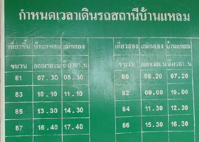 | 入って来た列車の行き先表示板を見るとメークロンとバーンレムを往復しているらしい、訊いてみるとバーンレム駅はサムッドサコンだというので列車で行く事にする。 |