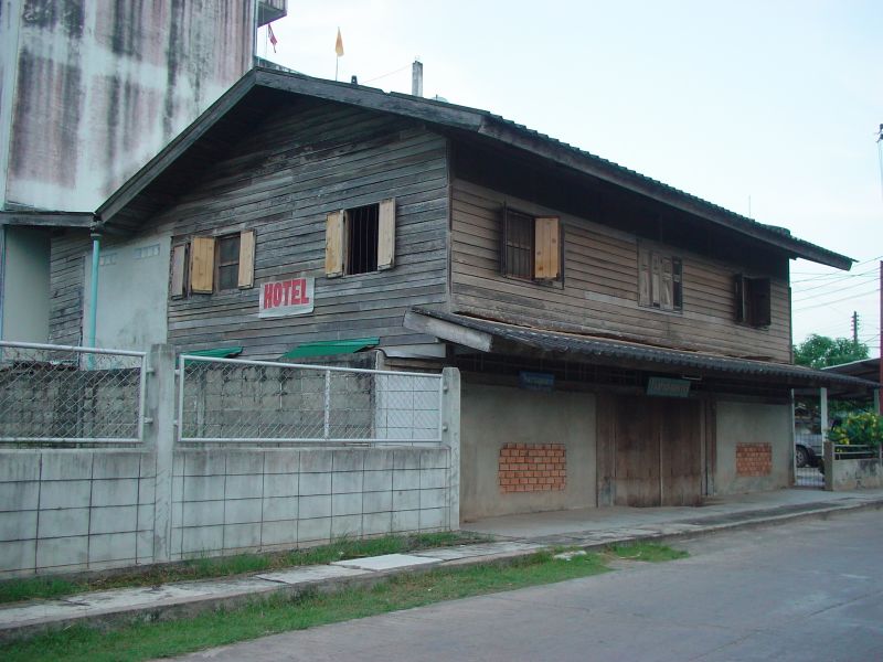 こうなると次の目的地クラブリ(クラ地峡)だけど、今からではちょっと遠い、「地球の・・・」を見るとスラタニーの郊外シュリーヴィジャヤ帝国の面影を残す町としてチャイヤーってのがあったのでそこへ行く事に。 どこに面影があるんだかわかんない町で唯一のホテル。 6時頃には表の戸は閉められて裏から出入りする、裏には鉄筋コンクリートの小さなホテルがある、ここのお寺で毎月1〜10日まで何かがあるそうでそれにフランが群がってるみたいで、道路に面した向かって右端の一部屋しか空いていなかった。 |