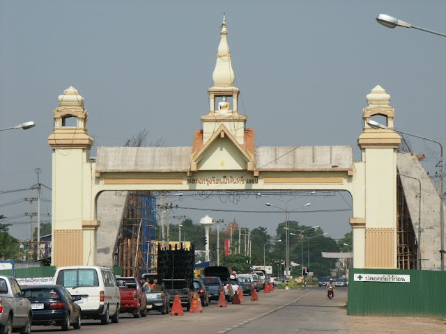 今回はウドン、ノンカイ、ナコンパノム、サコンナコンと回ってきた。 ノンカイからナコンパノムまで川沿いの道を行って見た、ポンピサイという所にも行ってみたかった事もある。 コンケンには相変わらず恐竜がのさばっていて電飾など身体に巻きつけられていたりする、コンケン駅の近くのコンケンに入る道路には立派な門が製作中だった。 |