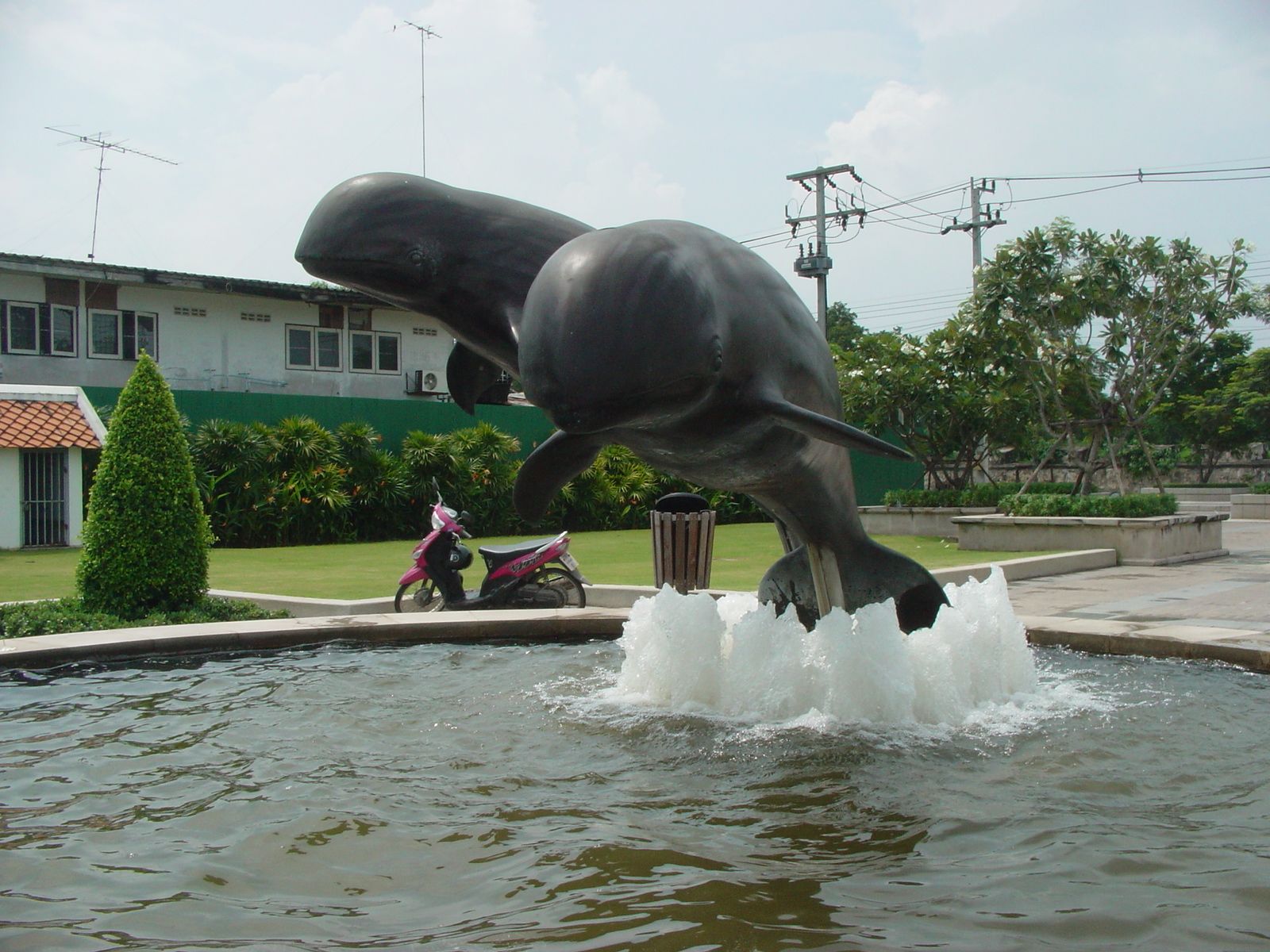 この辺には河イルカがいるらしい、河縁にあった公園にて。 イルカがあしらわれた道路標識もあった。