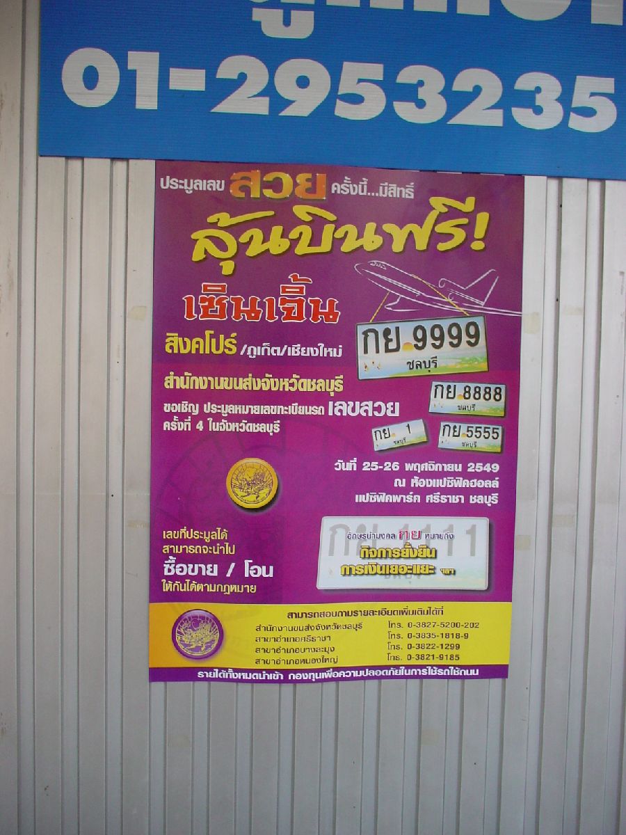 この頃よく見る絵の描かれたナンバーは「オークション」されているらしい、サタヒップのバスチケット売り場に貼ってあったポスター。
