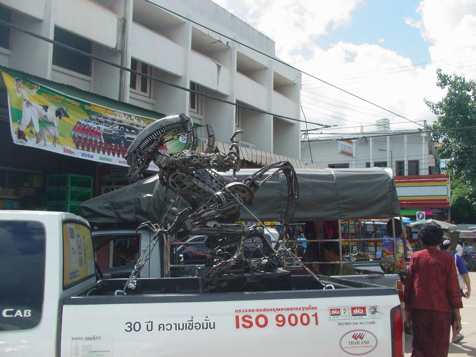 市場近くで機械のパーツなどを溶接して作った怪獣の様な物を積んだ車があったが何なんだろうか。 |