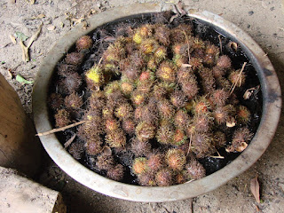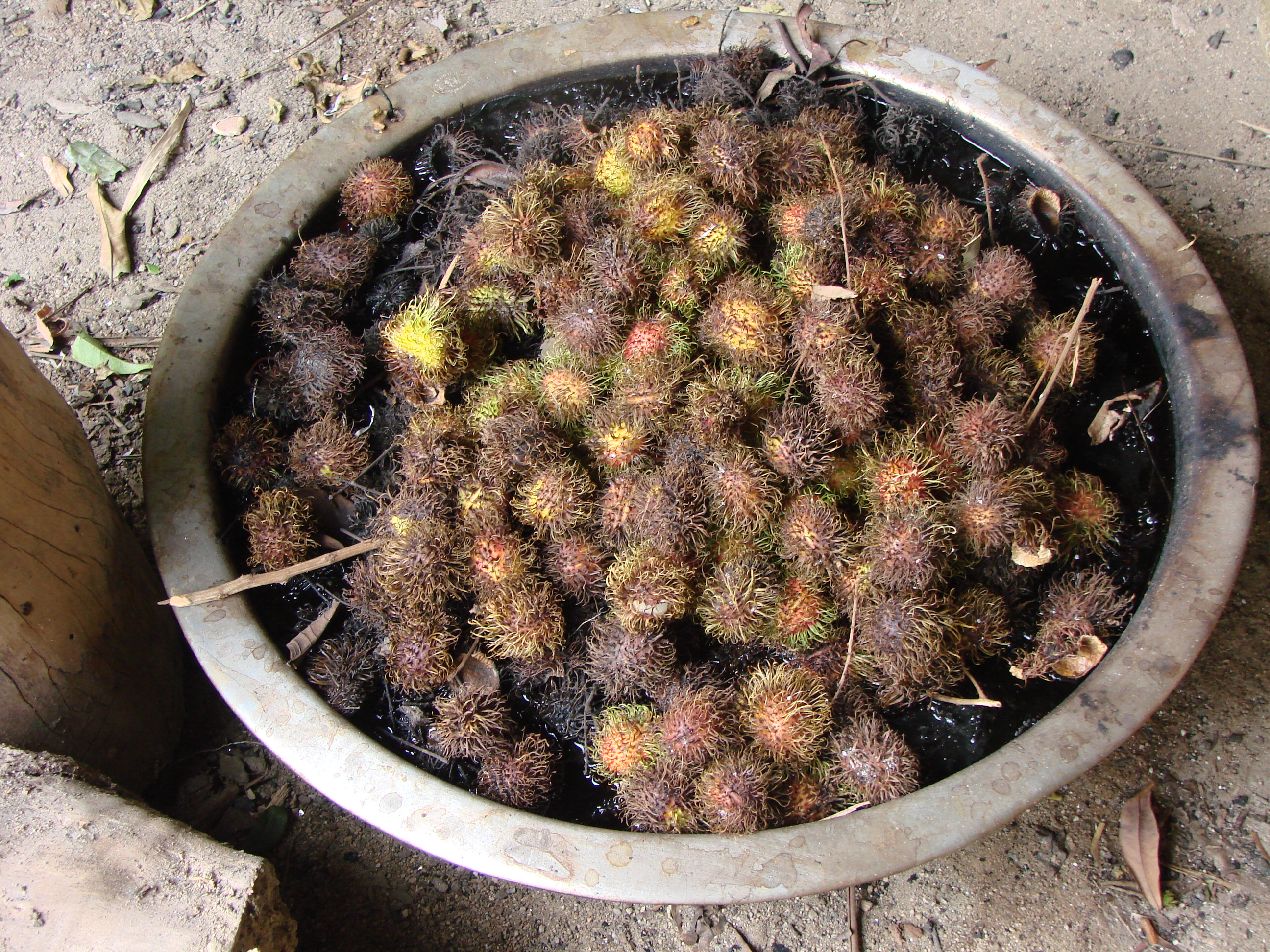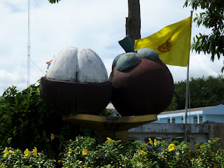 マンゴスチン、ドリアンなどの果物で名を知られているだけあって村の入り口には左のようなオブジェがあった。 |