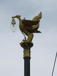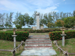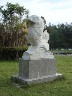パクメンの水族館前にある、ジュゴンとプンプイの像、ジュゴンはトラン県のシンボル、プンプイはトランにある水産物加工会社のシンボル(?)、多分水族館建設か運営に関わっていたかいるんだろうと思う。 |