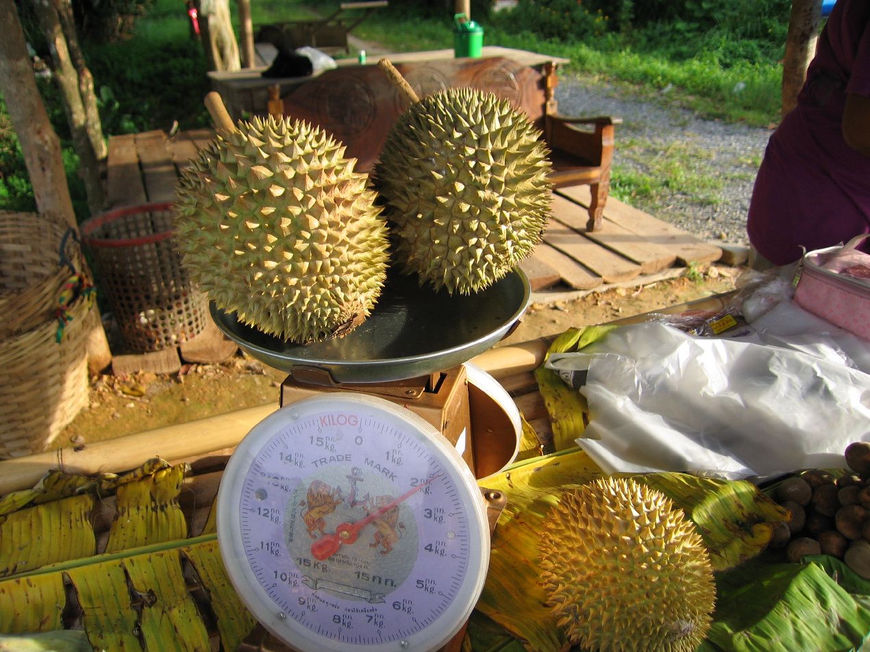 キリウォン村から帰る途中の道路で売っていたドリアン1kg/6バーツとの事で即2個購入、丁度2kgなので12バーツ、安すぎる。 |