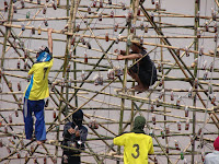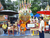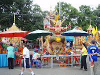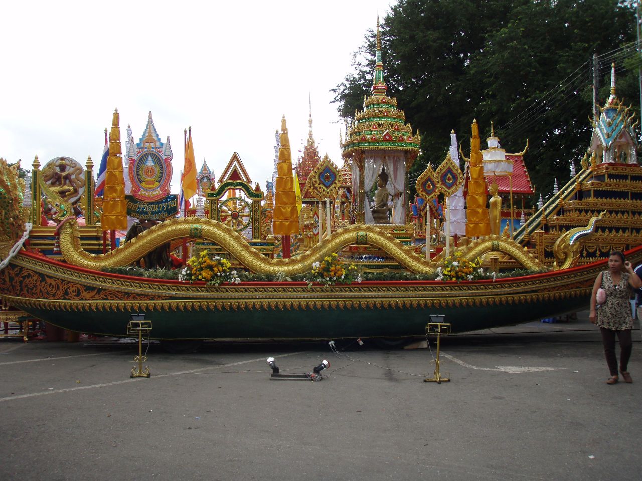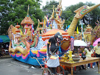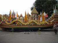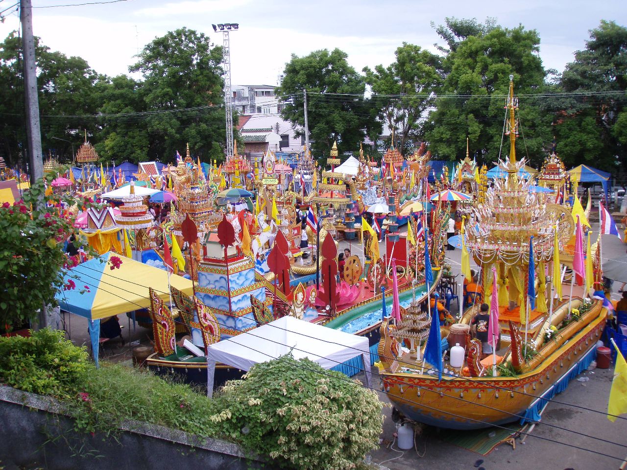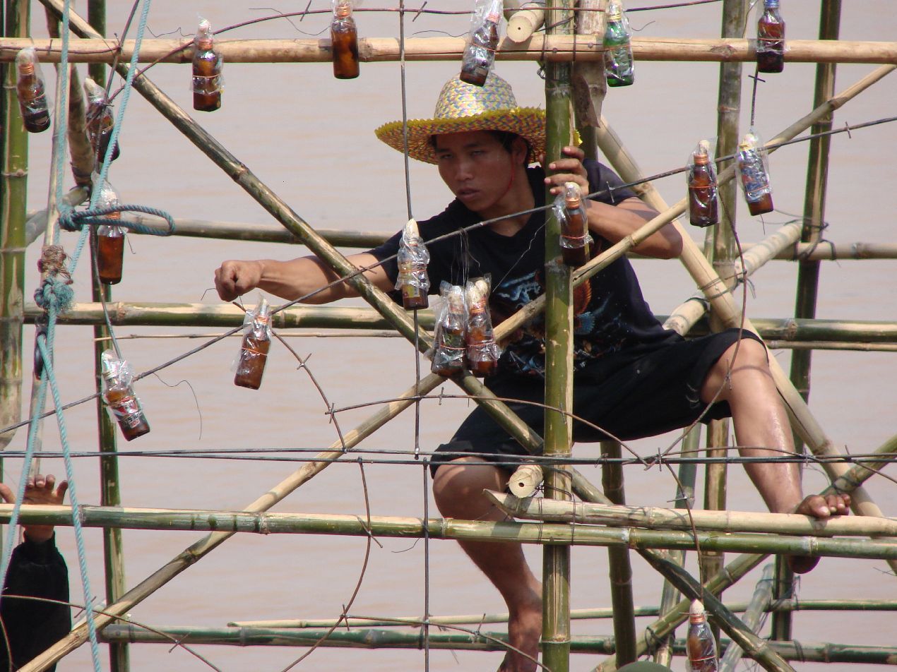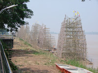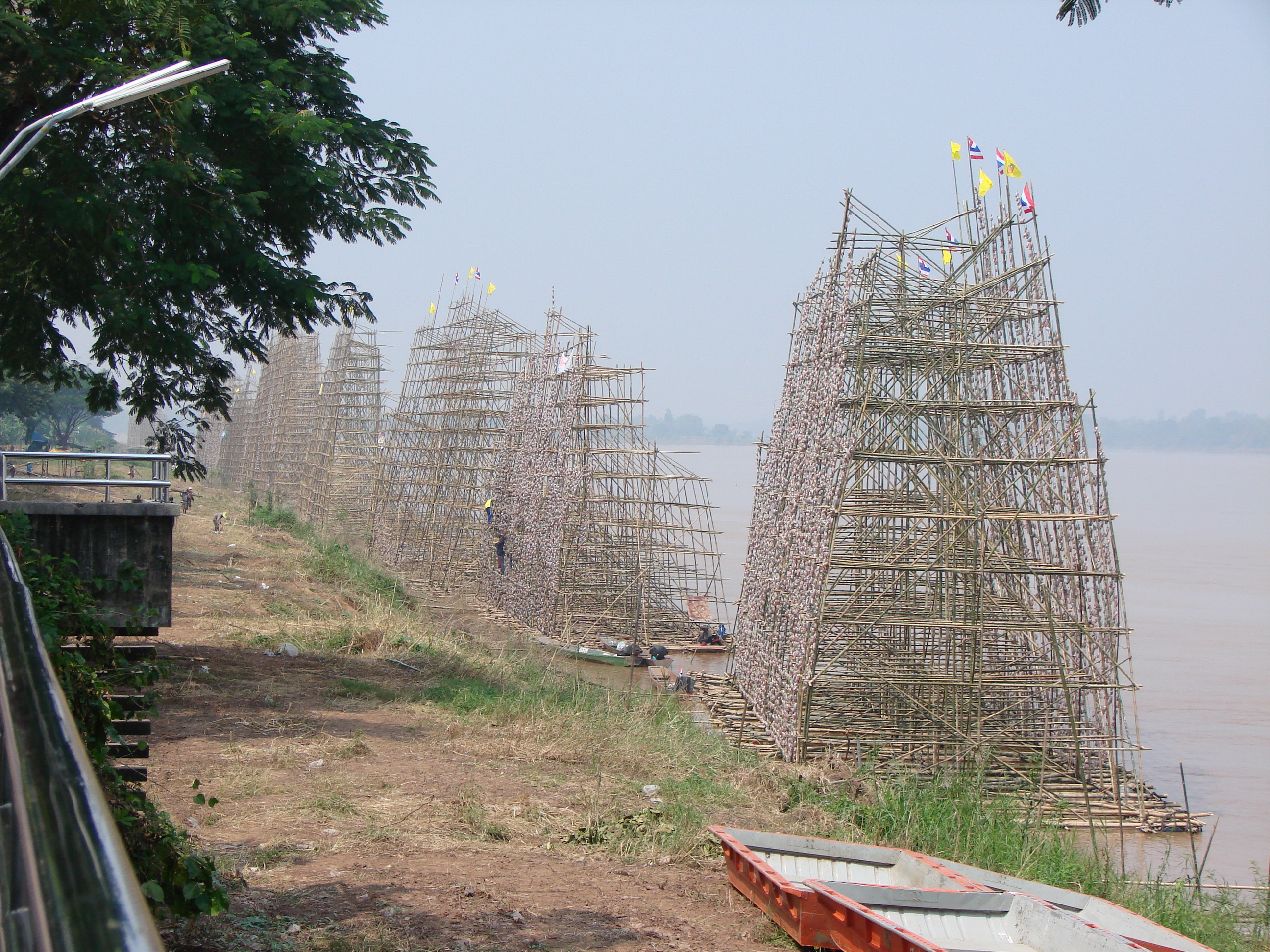 トランから2等寝台でバンコクへ出て途中の街などに寄りながらナコンパノムまで来た、去年は一日遅れで「ルアファイ」が見れなかった、今年こそはと思ったのだけれども日程の都合で前日にはここを離れなければならない。 去年は片付けで今年は用意、来年は見る事が出来るのか? 竹とドラム缶の筏に竹でやぐらを組み、鉄筋で表示したい文字やら絵を作りやぐらに取り付け、その鉄筋に無数のビンやら缶で作ったランプを取り付ける、全て手作業で一ヶ月程かかるそうだ。 |