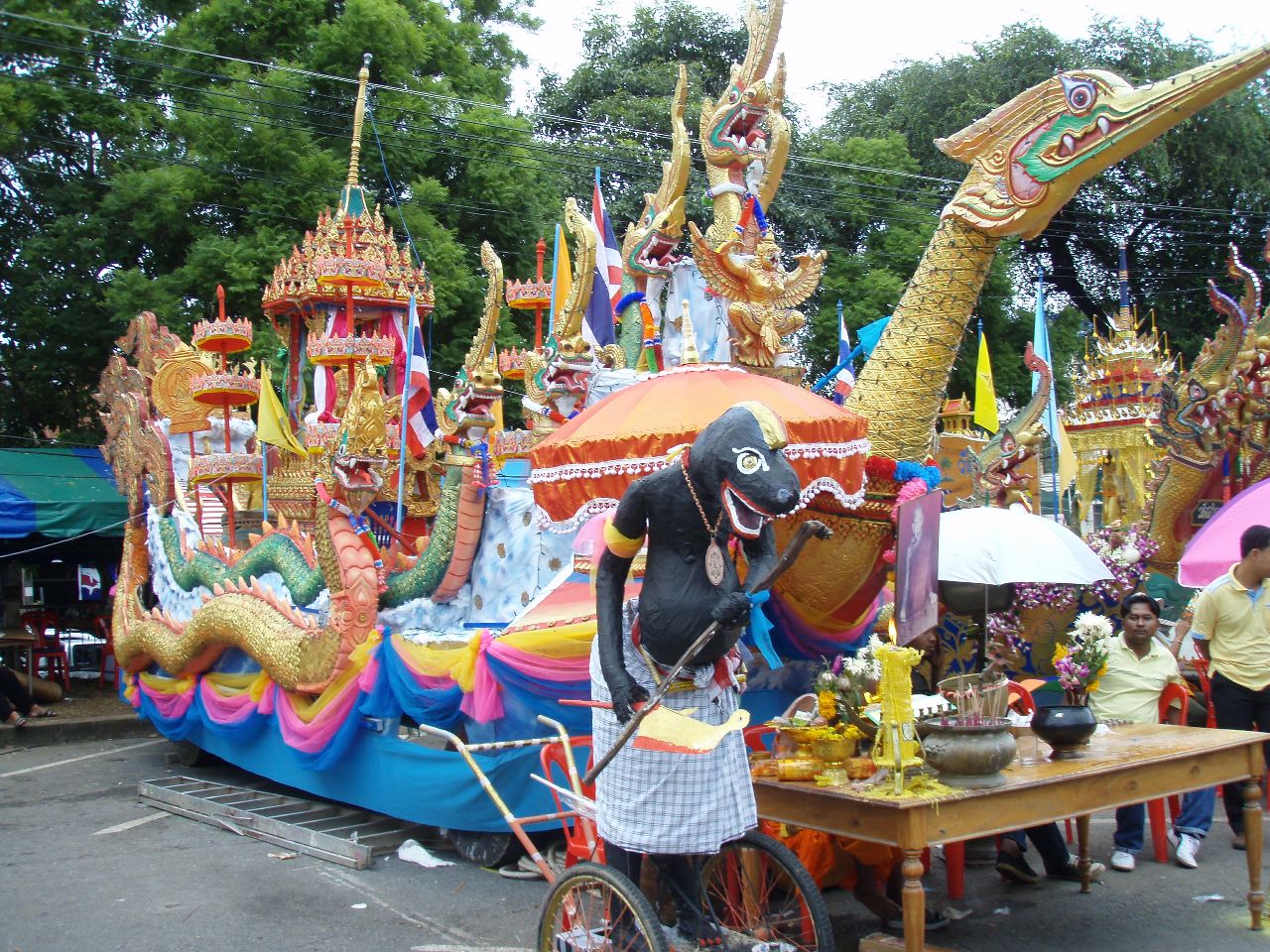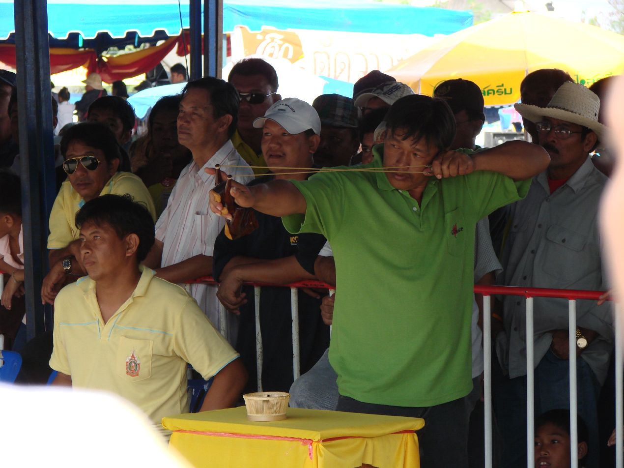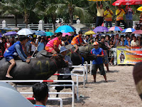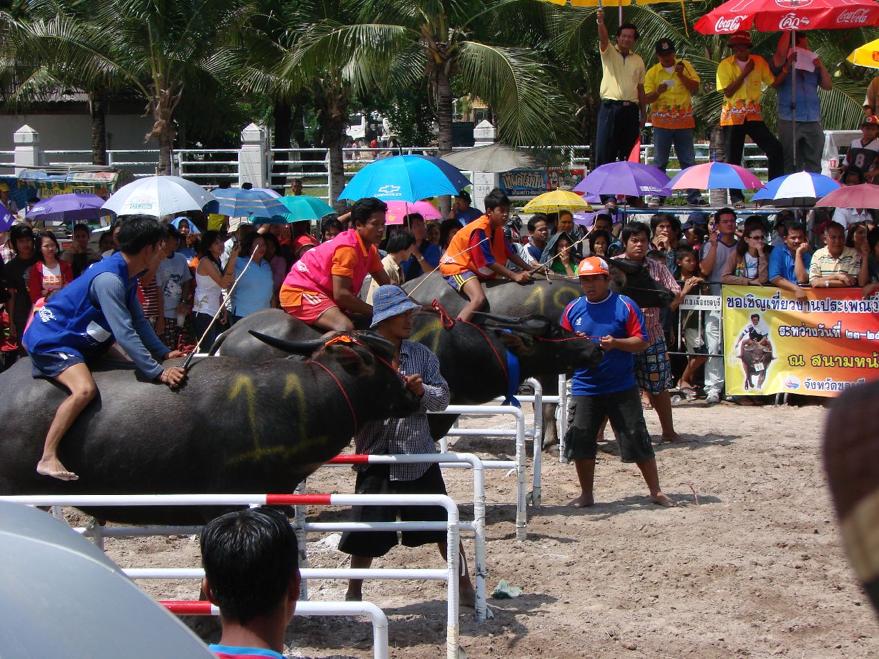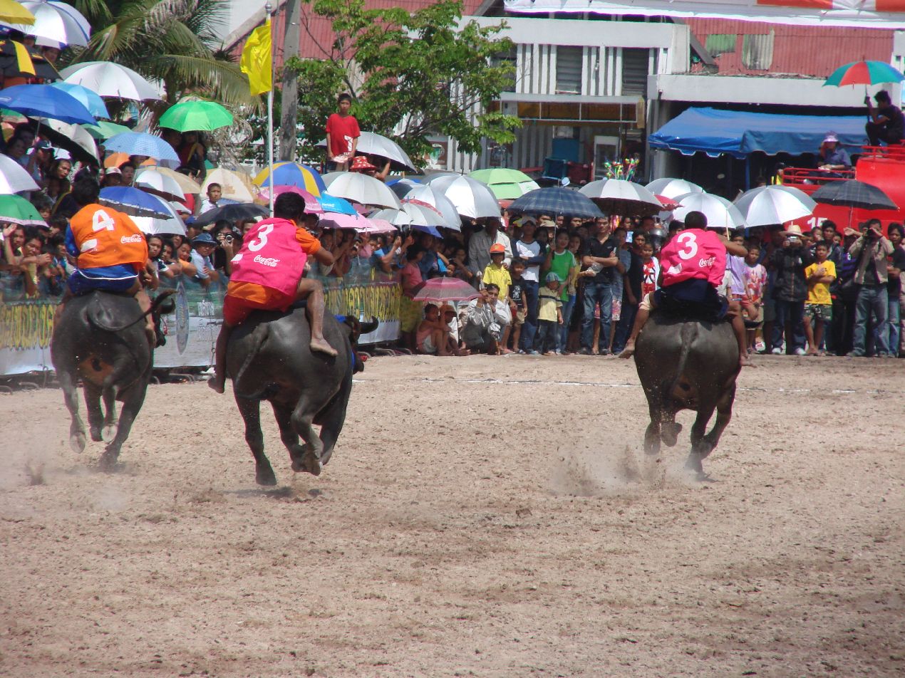 25日(明日)にチョンブリで水牛レースがあるとの事で今日はサタヒップで泊まり、明日朝チョンブリに来ればいいかなとバンコクから列車でサタヒップへ行く事にする。列車の中で、明日サタヒップからチョンブリまで来るというのが面倒だなと思いチョンブリで途中下車してしまった。 ホテルへ行くとテレビで水牛レースをやっている、以前の録画かと思い、明日やるんだよね?って訊いたら、今やっているのを中継しているという、慌てて見に行く。 市役所前に行くとどこにでもある屋台があって、モエタイだのタクローだのその他色々な事をやってたりする会場があって端のほうで水牛のレースをやっていました。 水牛も走るのが本職ではないので中々スタートで並ぶと言うのが出来ません、勝手に走りだしてしまったりして、スタートするまでが大変そうです、走りだすと、へェーあの水牛がというほどの走りっぷりでした。 |