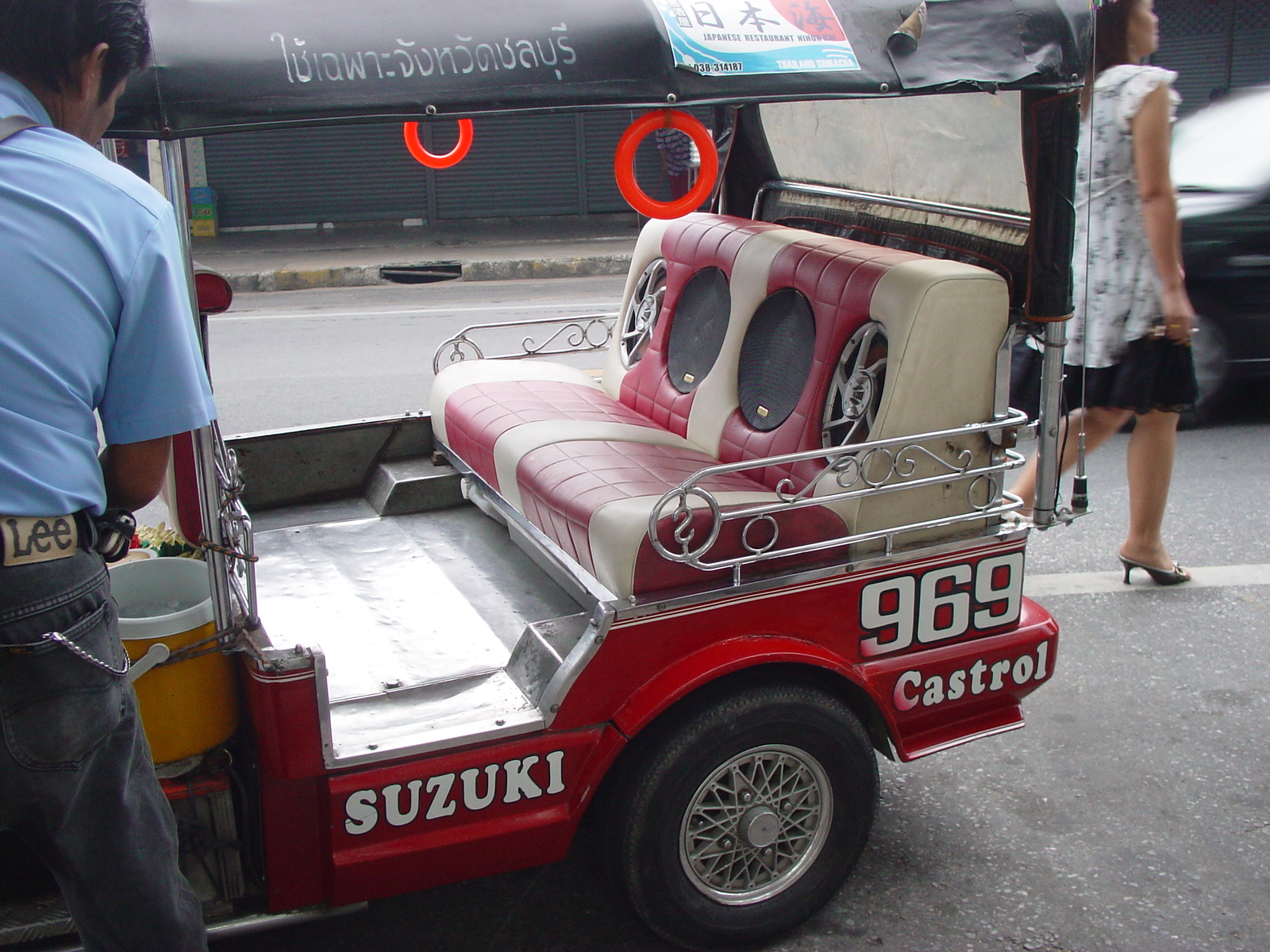 | シーラチャ駅の鐘とシーラチャで見た背もたれがスピーカーのトゥクトゥク |