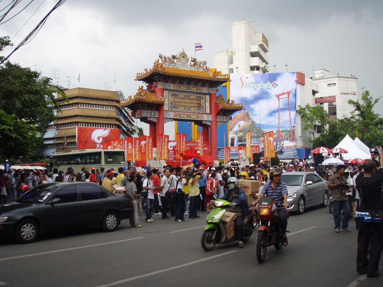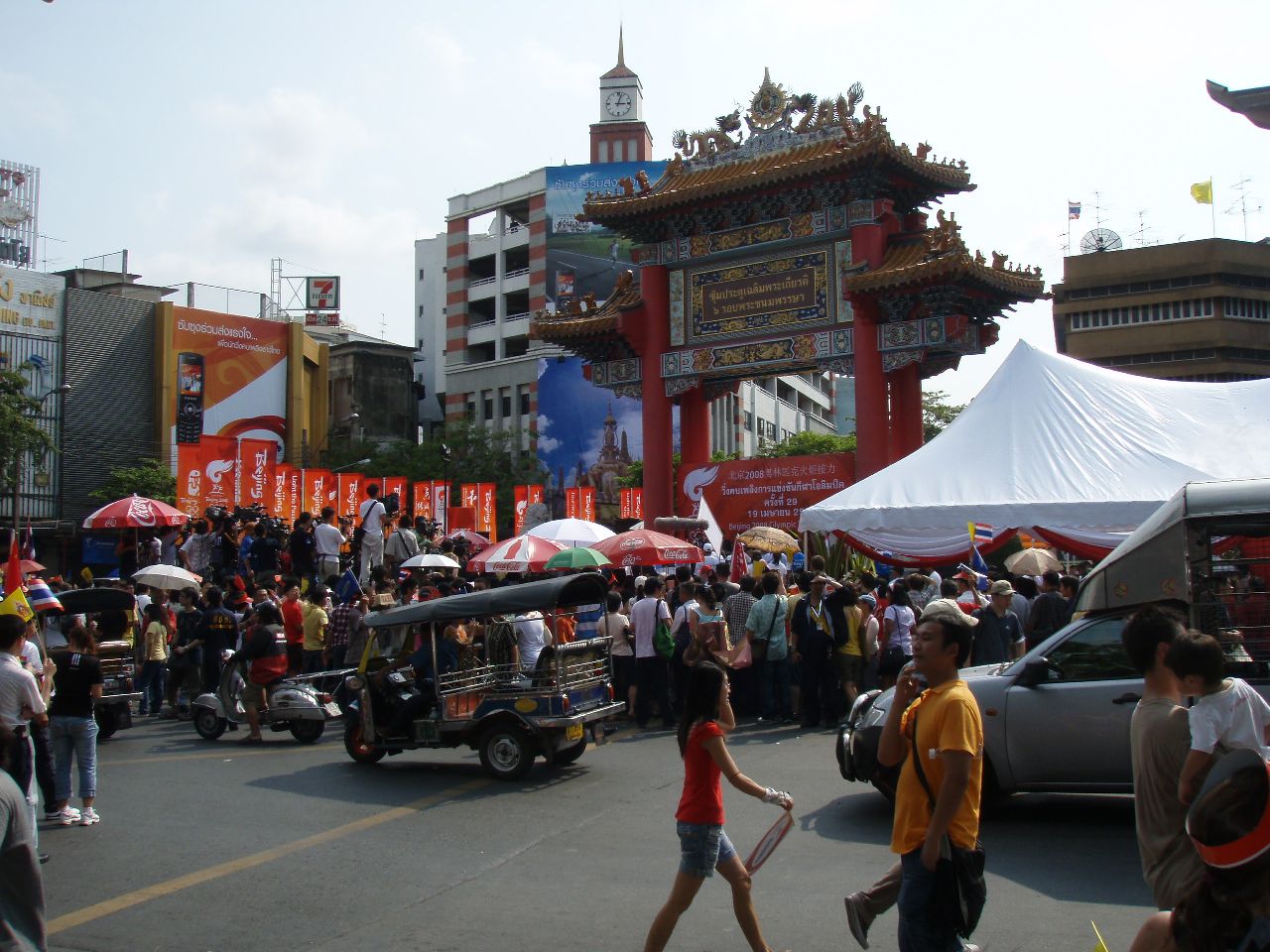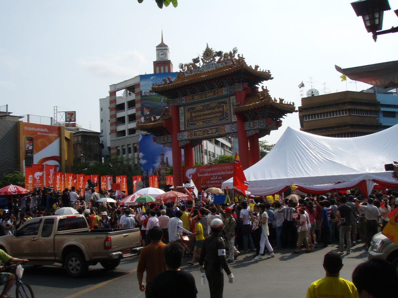昨年10月にイサーンを回った時にバンコクで見たヤワラーを巡回する路面電車のようなバス(無料)に乗ってみた、フォアランポン前の橋の袂から出る、運転手のオネーサンは「混んでいなければ20分」とか言いながら10分で一回りしてしまった。 出発してすぐ左に折れて中華街の門へ、ここが今日の聖火リレーのスタート地点だ。 |