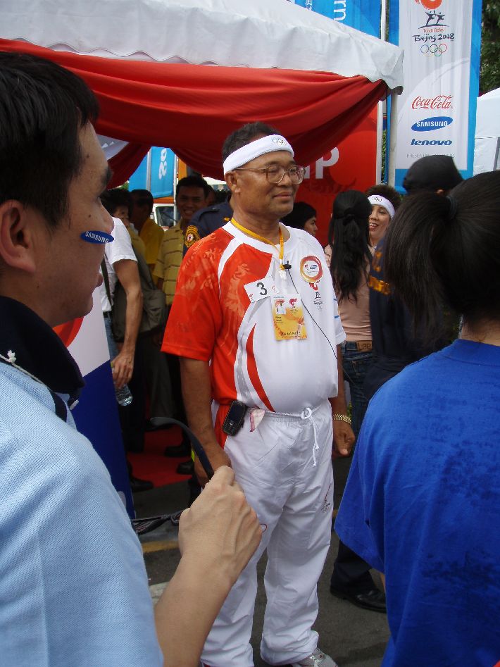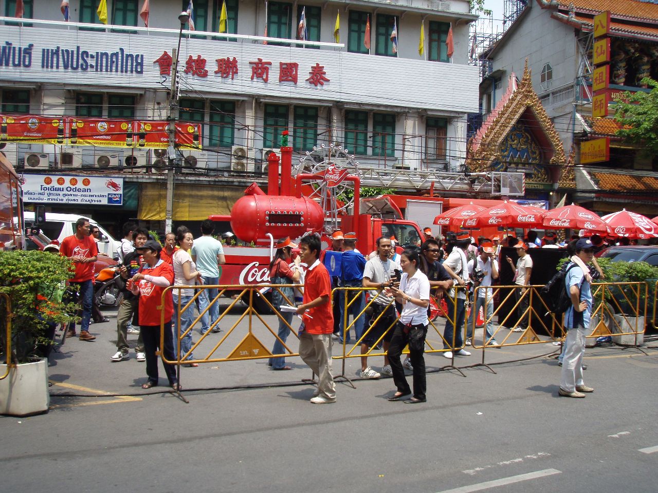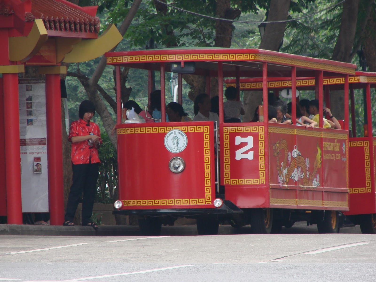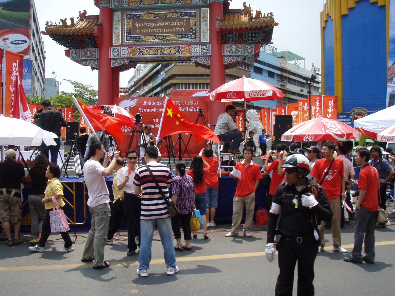 昨年10月にイサーンを回った時にバンコクで見たヤワラーを巡回する路面電車のようなバス(無料)に乗ってみた、フォアランポン前の橋の袂から出る、運転手のオネーサンは「混んでいなければ20分」とか言いながら10分で一回りしてしまった。 出発してすぐ左に折れて中華街の門へ、ここが今日の聖火リレーのスタート地点だ。 |