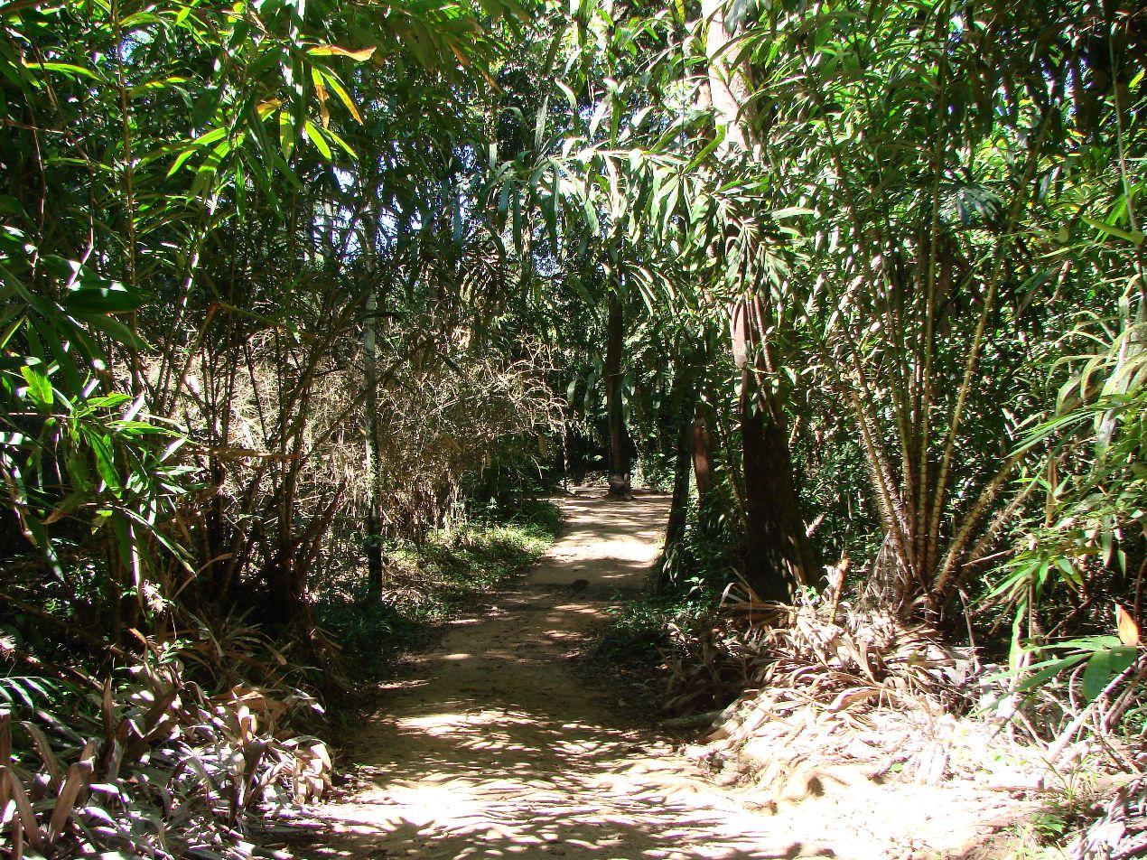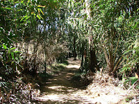 看板の道を行くと木の門と受付があって、入るには記帳していけって書いてあるけど、ノートも人もいない、幸い門は開いていたので勝手に入って行く、左の写真のような道を600m行くんだそうだ、ここ何回か雨が降ったせいかジメジメして暑く汗が滲む。 途中赤アリの大群や右の写真のアリ(?)がうじゃうじゃ |