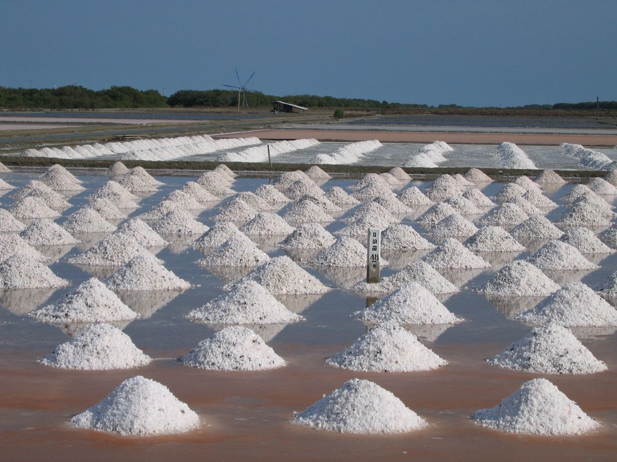 | バンコクから西へ向かう35号線を行くと、サムットサコン、サムットソンクラムあたりにかけて道路の両脇に塩田が広がる、雨季には何もない田んぼのようだが、この時期にはそこらじゅうが塩の山になっている。 |