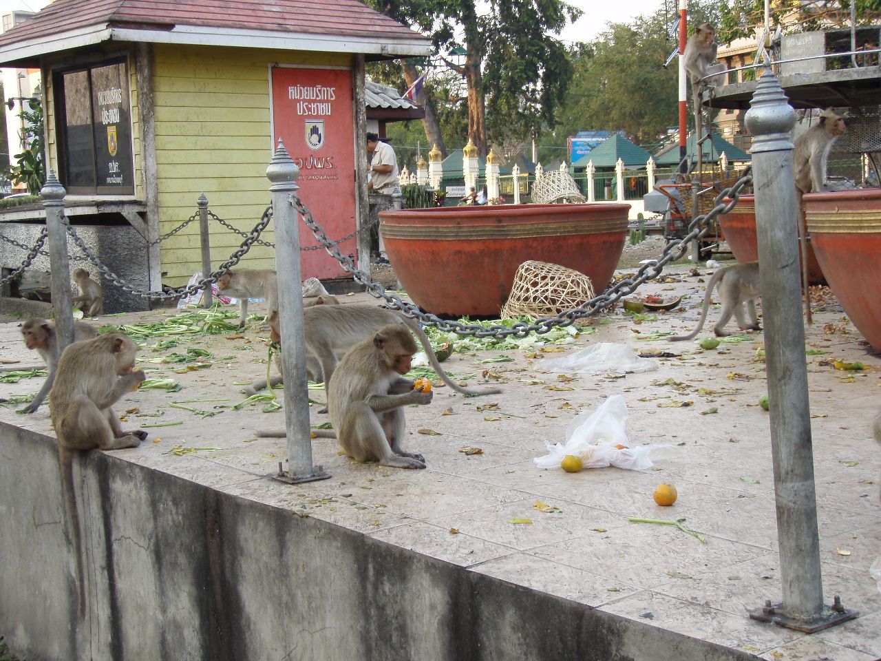 | ロブリは遺跡と猿で有名、新市街と旧市街とあり遺跡や猿は当然旧市街、新市街と旧市街を結ぶ道路が線路と交わるあたりに猿が多く、そのあたりのホテルは金網で覆われている、窓のすぐ外を猿がウロウロとしていたり非常口あたりにたむろっていたりする。 |