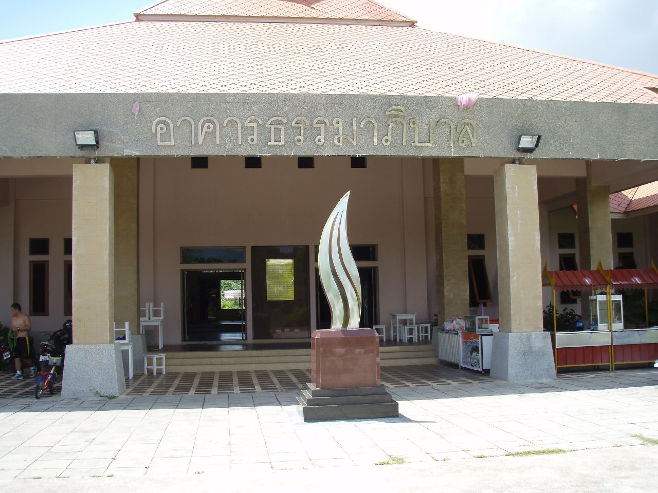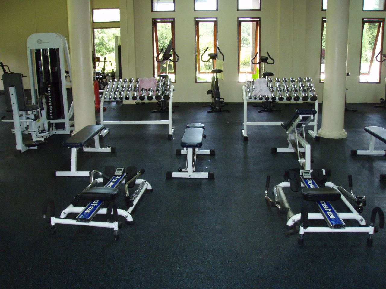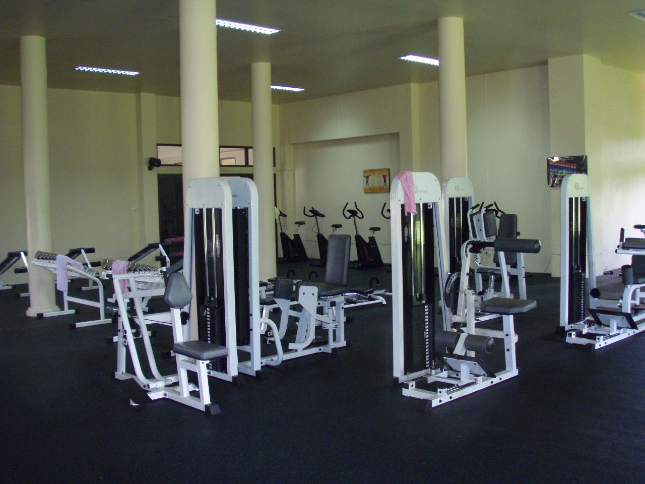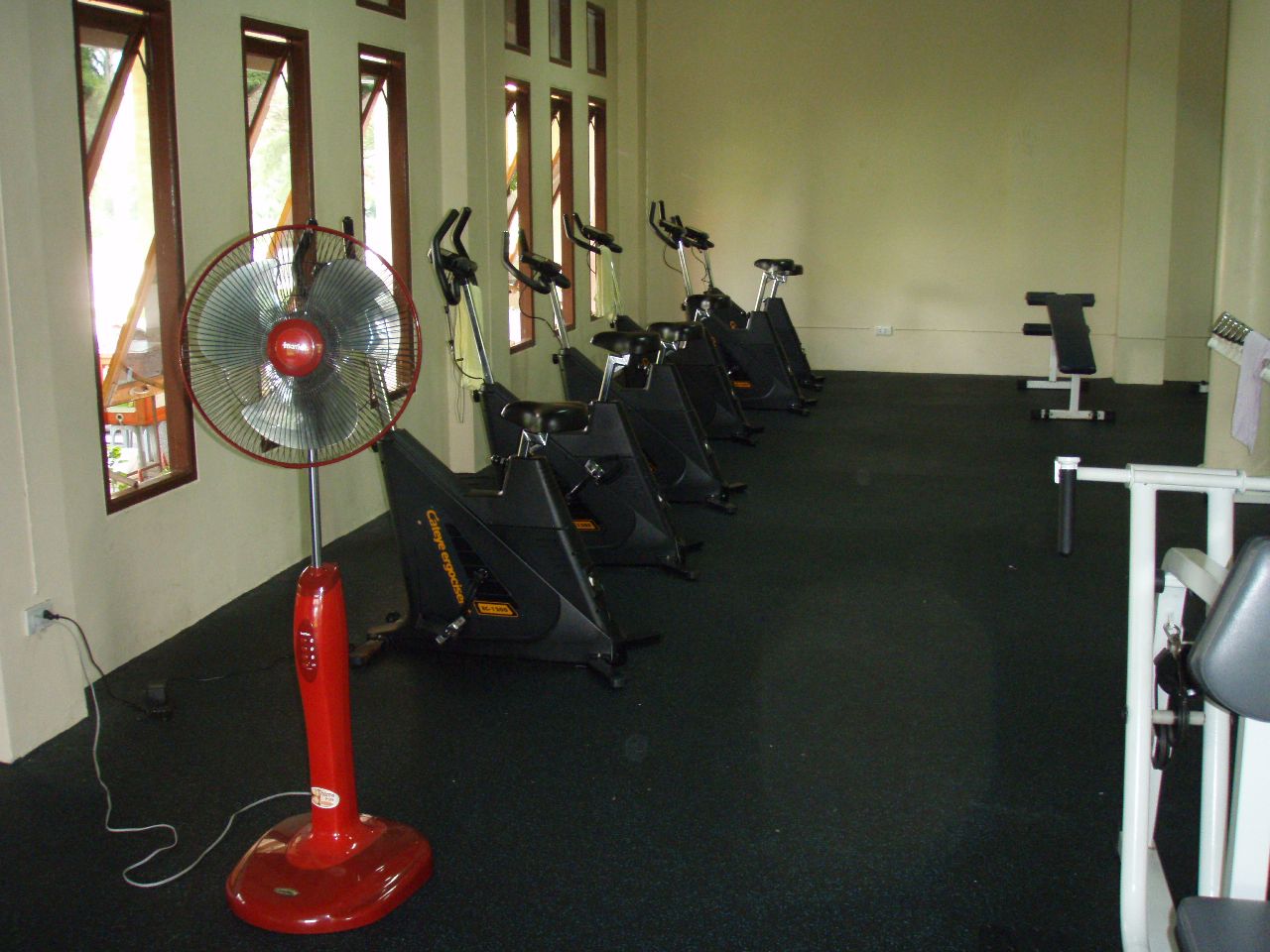 近くの公園にフィットネス・クラブがある、この公園には暇なもんだからちょくちょく来ていたのだが、この建物が何であるかは気にも留めていなかった、先月ふと中を見ると何やら運動をしているらしい人影が見える、入り口を入ると正面にマッサージ室、右がフィットネス・クラブで左がエアロビクスの部屋になっている、エアロビはタイ各地で公園・広場で夕方やっているのを見る、ここも夕方から開催されるのだろう、フィットネスの部屋では西洋人が一人ダンベルを上げ下げしていた。 受付にいた女の人が入っていいよと言うので入って運動器具などを見ていると、器具の修理か点検をしていた人が来て、器具の使い方などの説明してくれた。